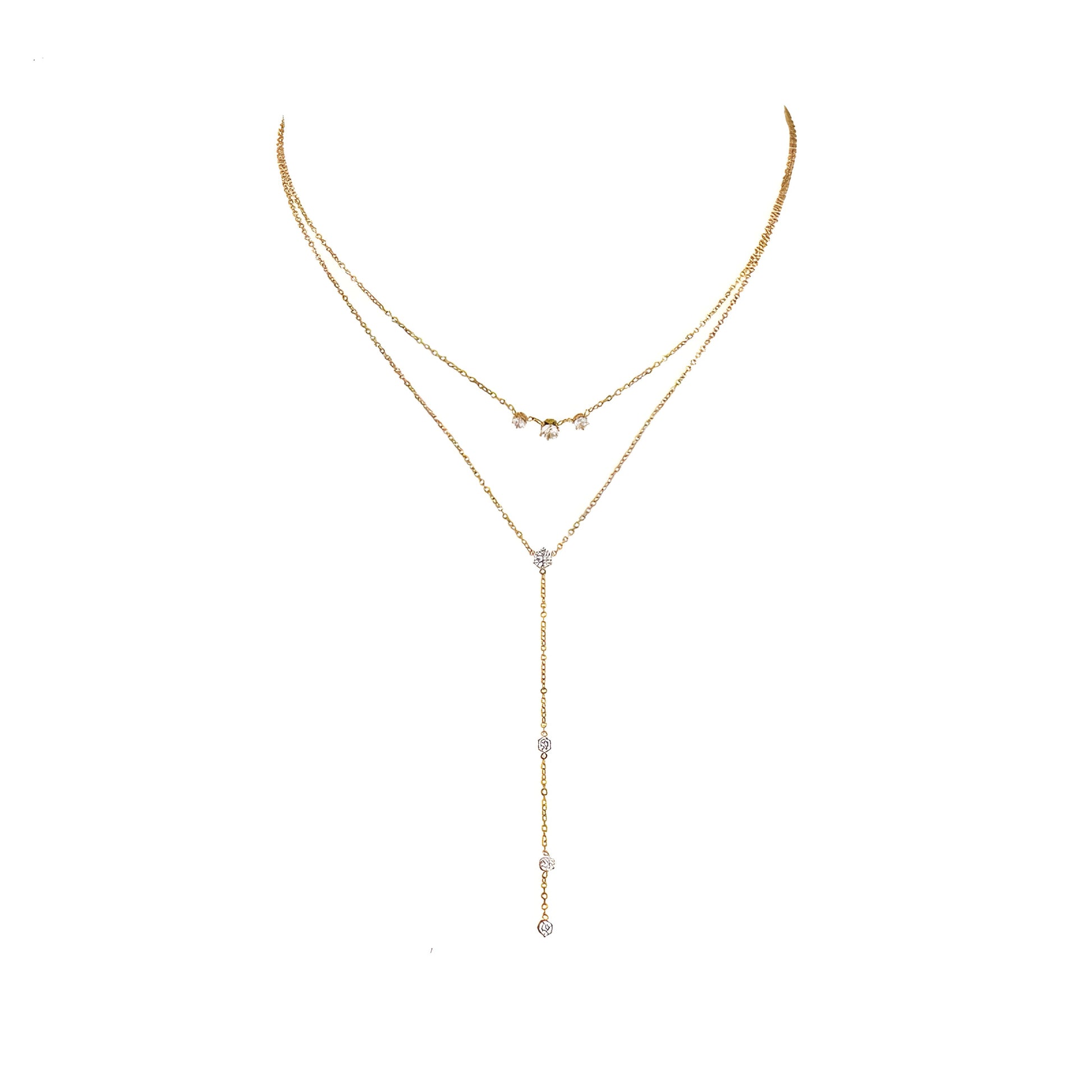 This chic necklace features a layered design with two delicate chains adorned with small, sparkling diamonds. The shorter chain has three small diamond-like stones placed evenly, while the longer chain dangles with one larger stone at the center, creating a subtle yet elegant drop effect. Its dainty design and glimmering accents make it a versatile piece that can be worn casually or with more formal attire.