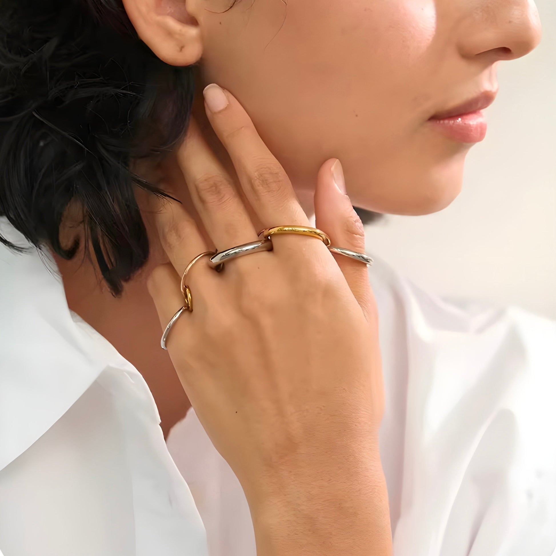 These rings, designed with a blend of gold, silver, and rose gold tones, are a truly modern and unique choice. The interlocked circular design and contrasting colors make it a versatile and stylish accessory, perfect for any outfit—from formal to casual. This design, which is trending this year, exudes elegance and creativity, making it a bold choice for those who seek charm and individuality.