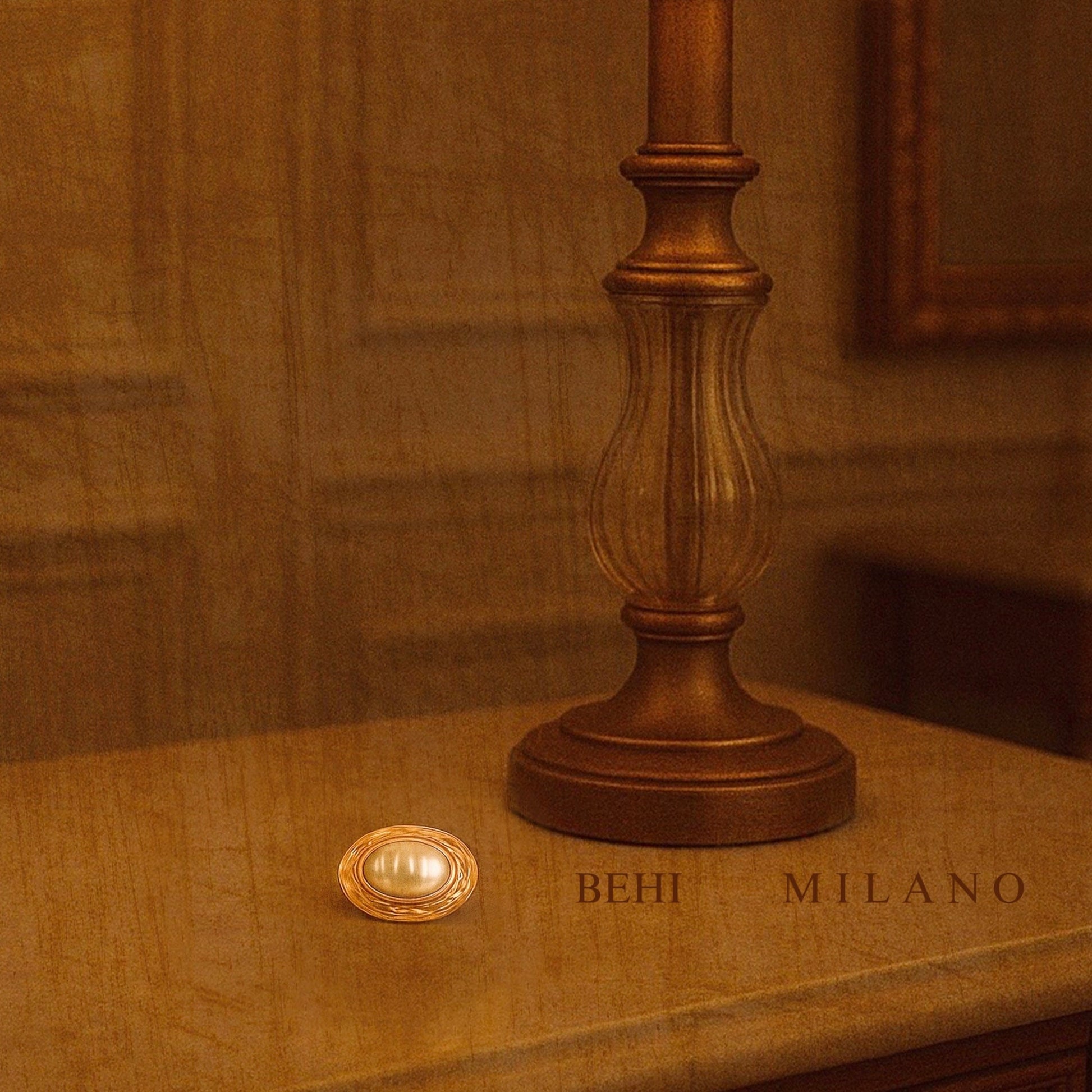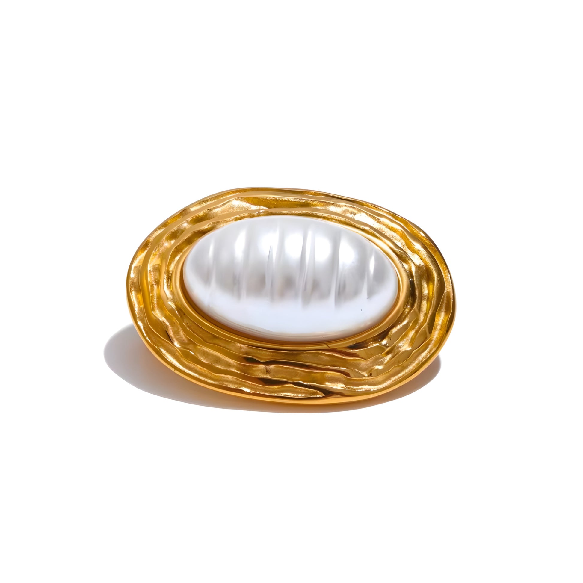 This brooch features a stunning combination of a golden textured frame surrounding a smooth, lustrous faux pearl in the center. The oval-shaped pearl has a soft, polished sheen with subtle ribbed details that enhance its elegance. The golden border around the pearl has a wavy, organic texture that adds a unique and sophisticated touch, creating a perfect contrast with the smoothness of the pearl.