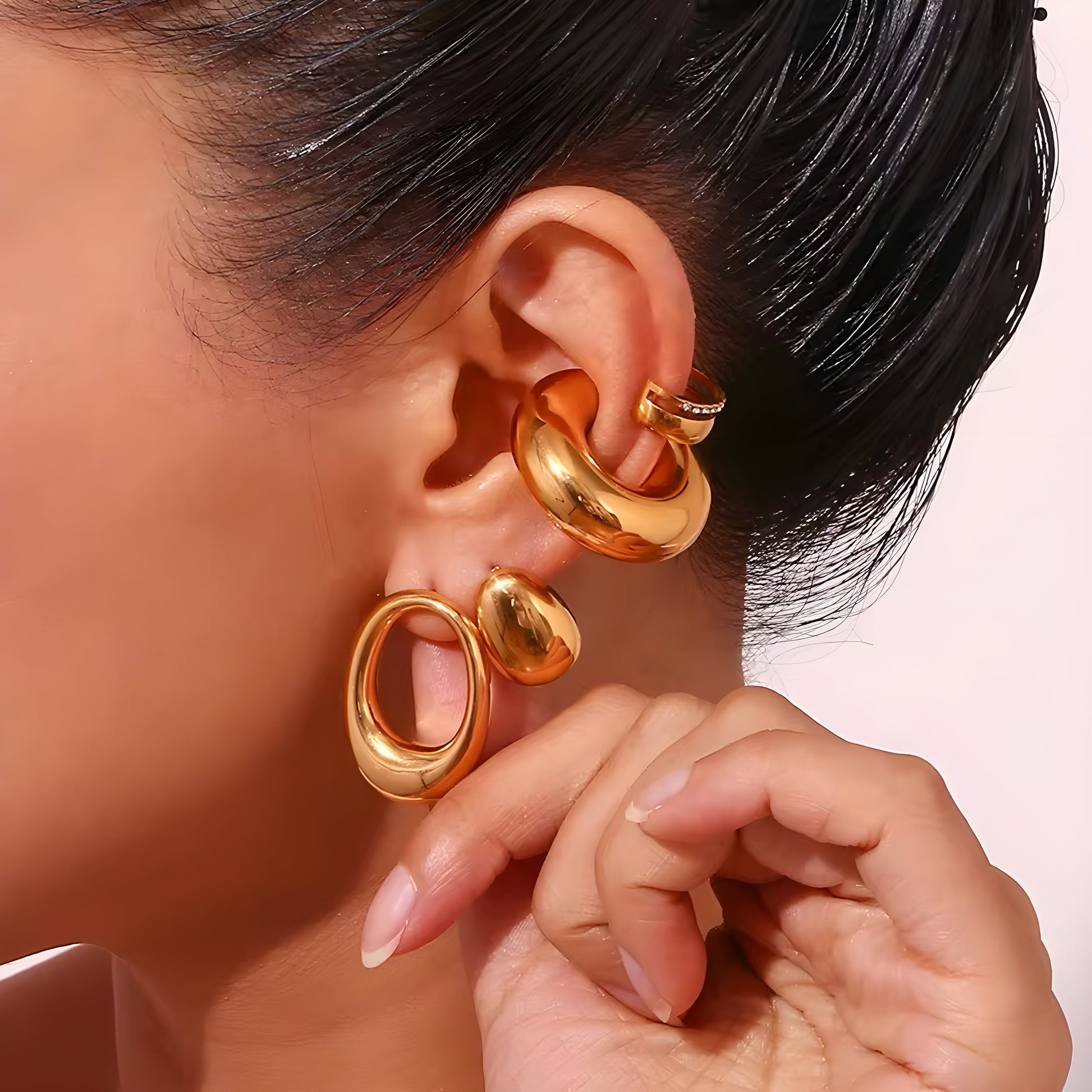 These earrings feature a contemporary and sculptural design with a bold, oversized shape. The golden finish is smooth and glossy, giving them a sleek, polished appearance. The earrings combine a circular shape with an oval element, creating a sense of dynamic movement and volume. The smooth, fluid contours make these earrings look modern and avant-garde, perfect for adding a statement piece to any outfit.