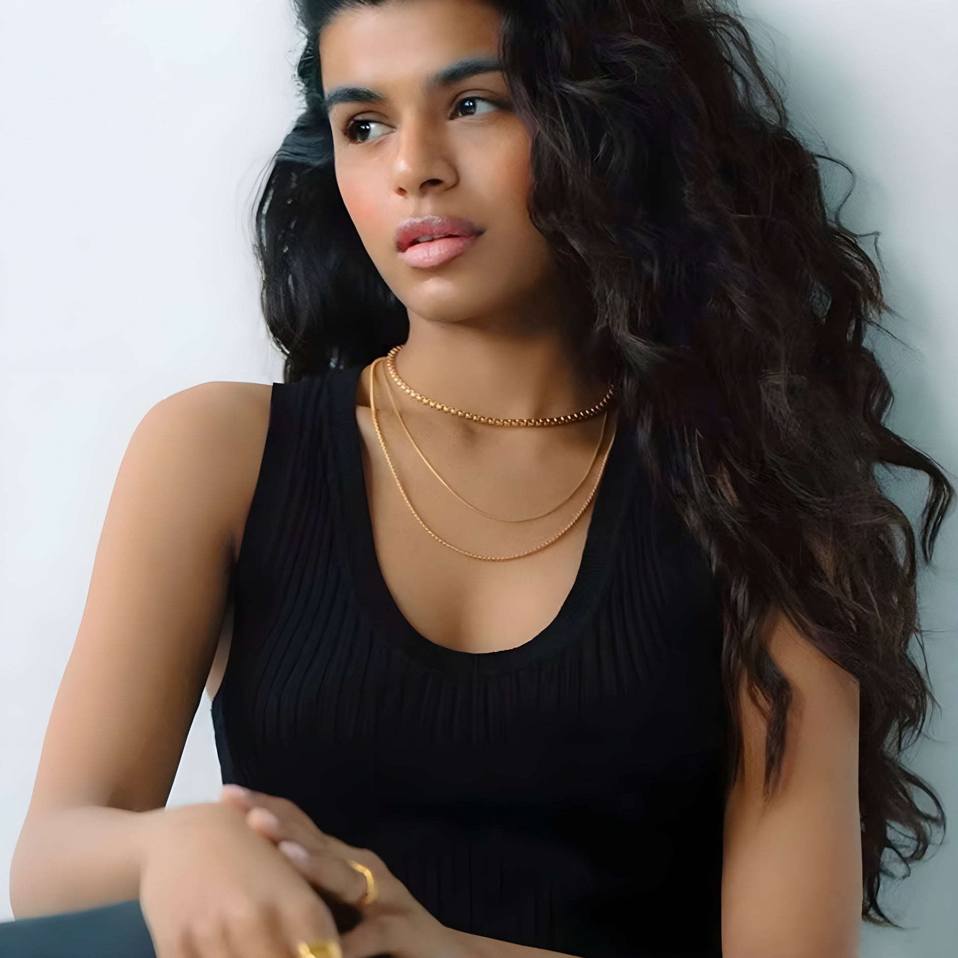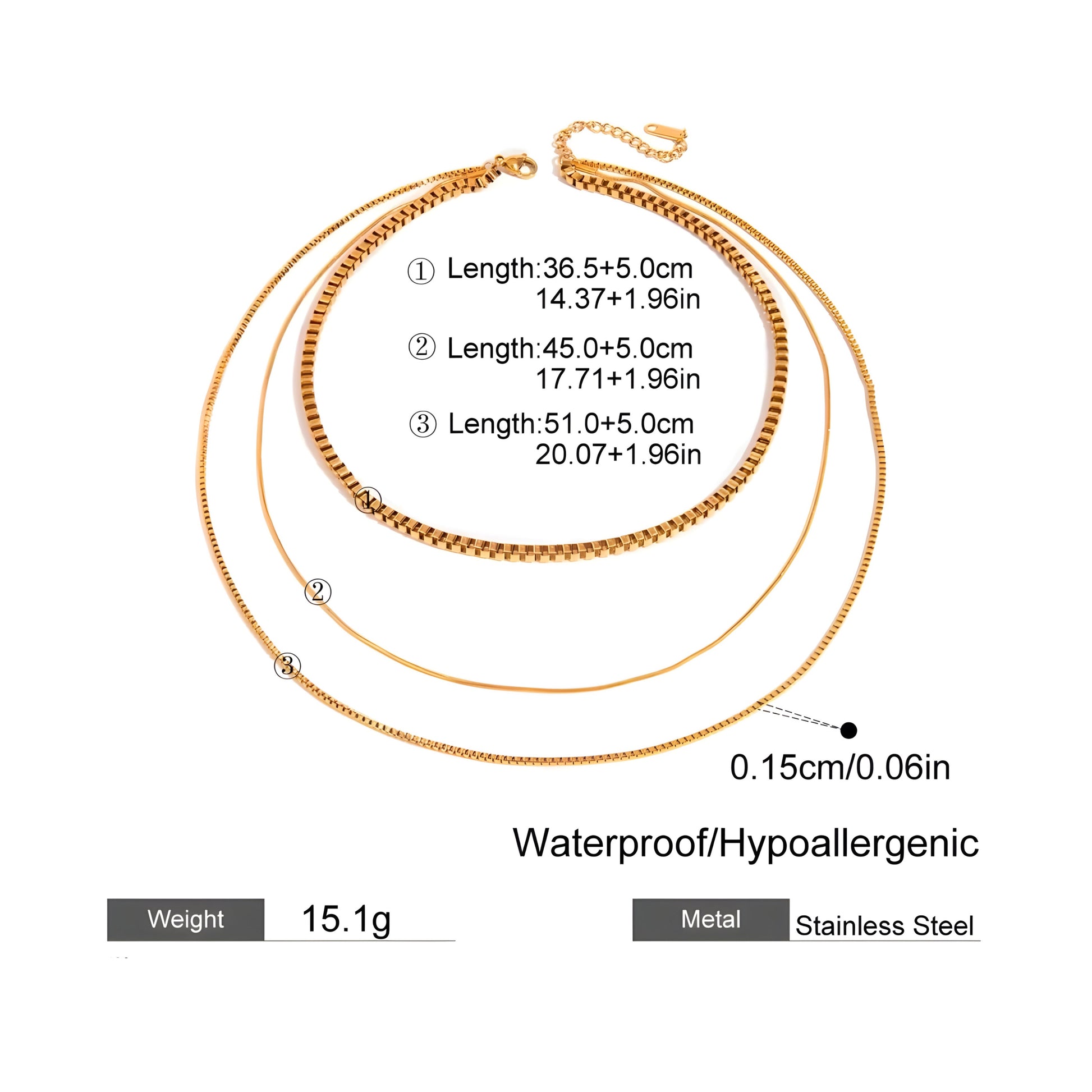 This layered gold necklace is an essential piece for anyone who appreciates sleek, modern designs combined with a touch of timeless elegance. The combination of different chain textures adds interest and sophistication to your jewelry collection.