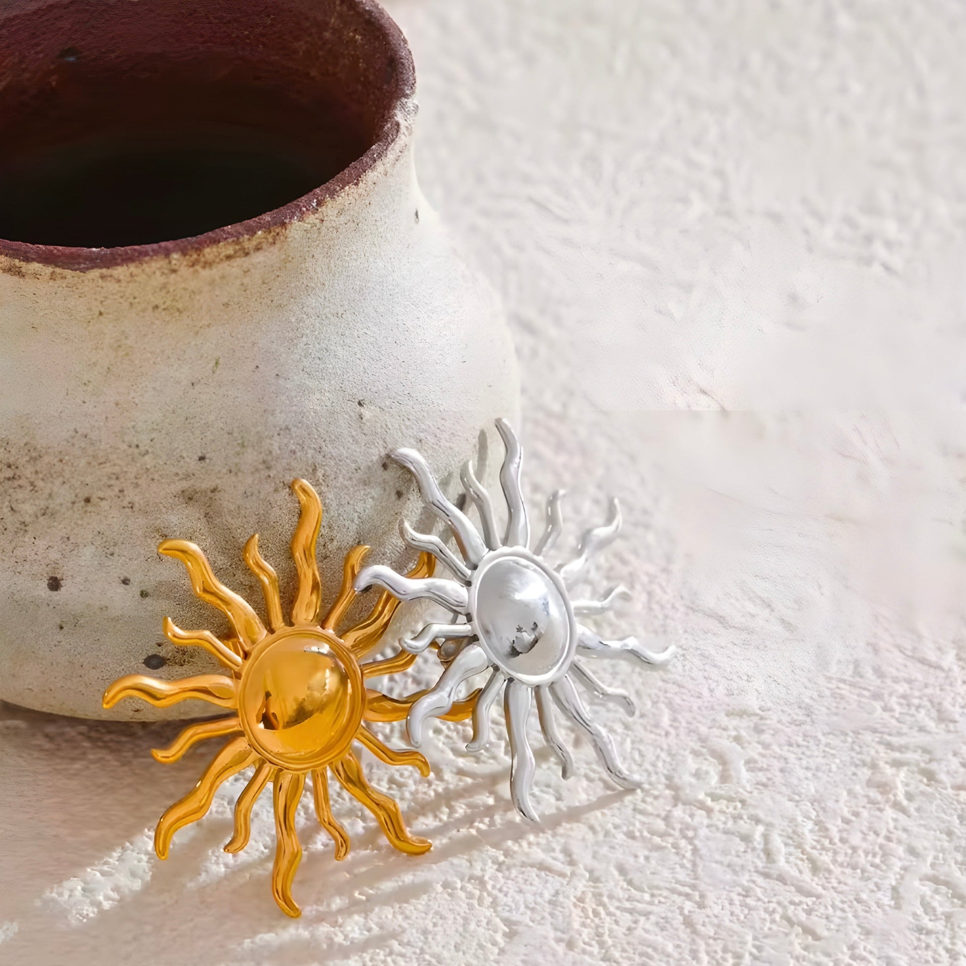 This brooch has a beautiful golden design in the shape of the sun. The center of the brooch is a raised circle, with curved rays radiating outward, creating a unique and artistic look. These rays elegantly extend from the center, giving the brooch a dynamic and flowing appearance with a glossy golden finish.