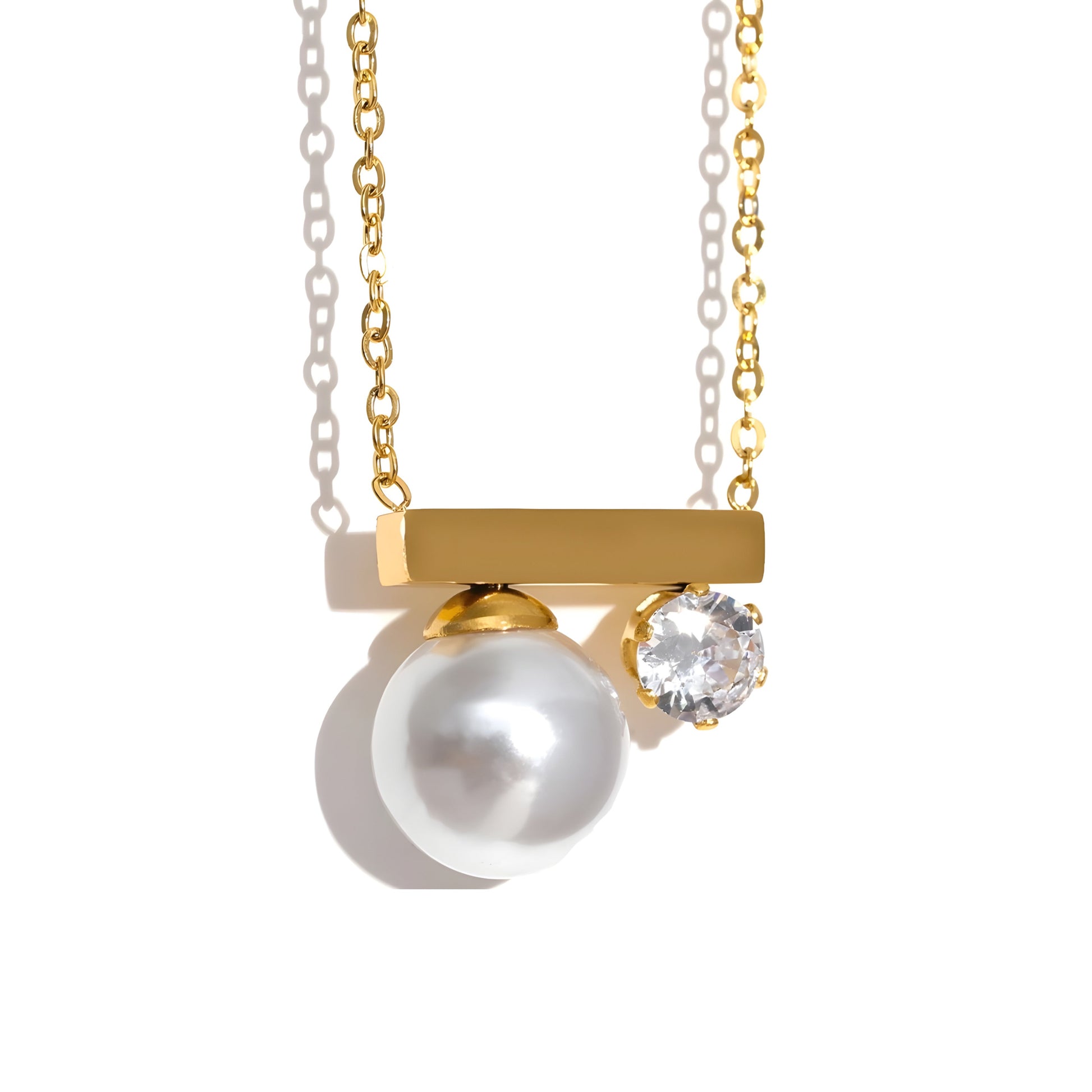 This necklace features a delicate design with a combination of a pearl and a clear diamond-shaped stone. The pendant consists of a polished, round pearl that hangs elegantly alongside a smaller, glimmering gemstone, both suspended from a sleek, gold bar. The overall design is simple yet sophisticated, with a focus on contrasting materials, where the smoothness of the pearl meets the sharp clarity of the gemstone, giving it a refined, balanced look.