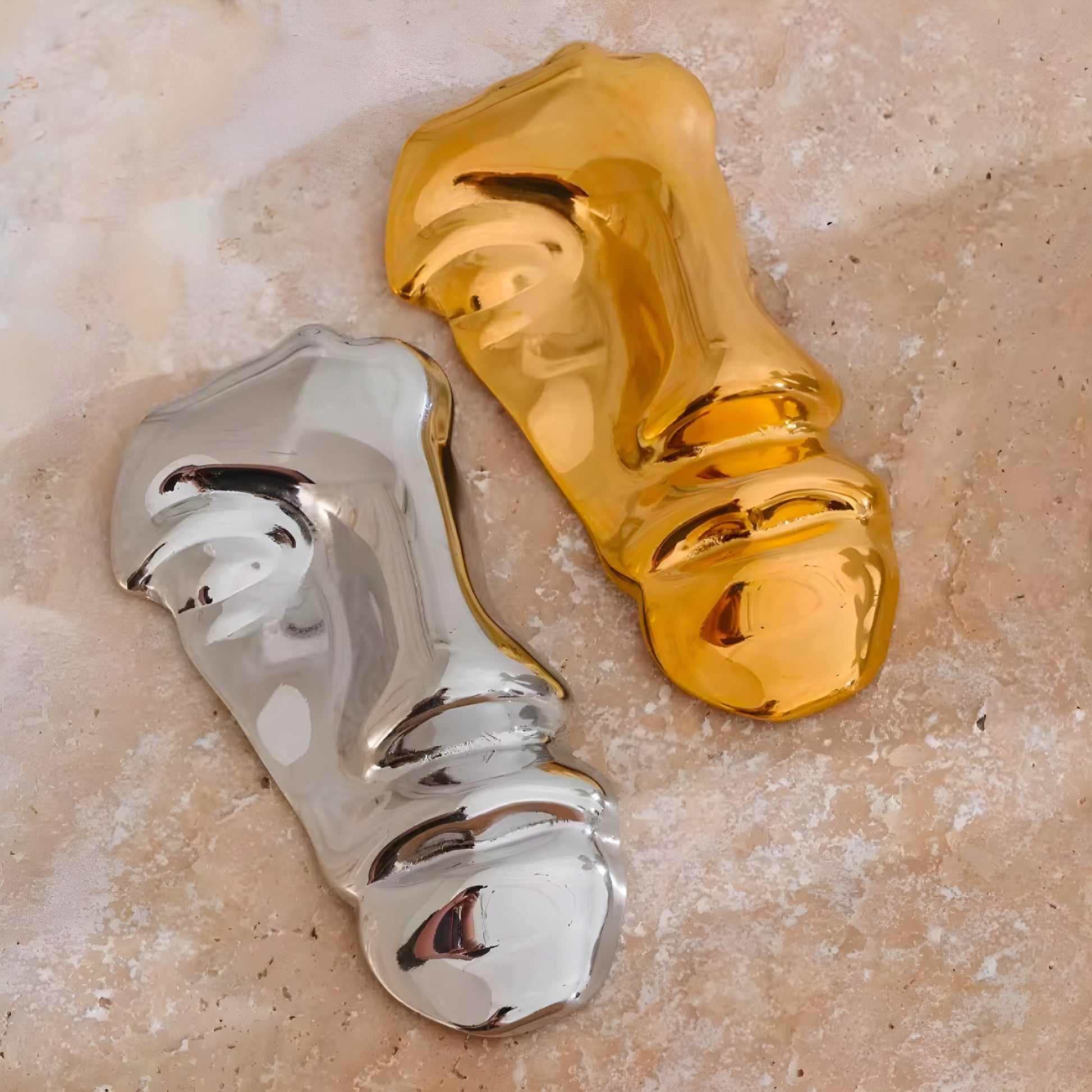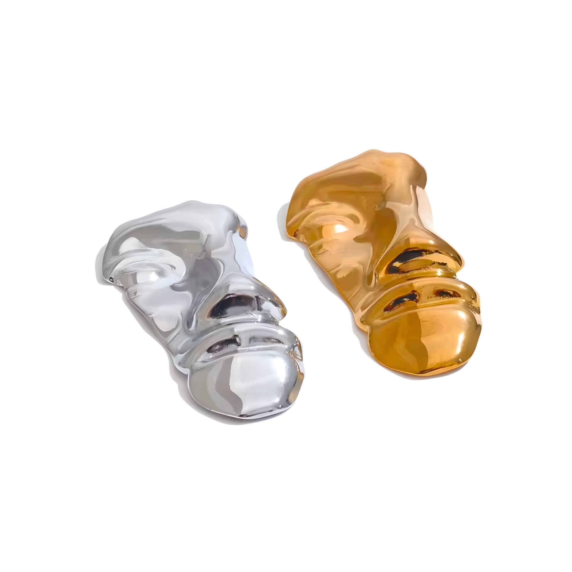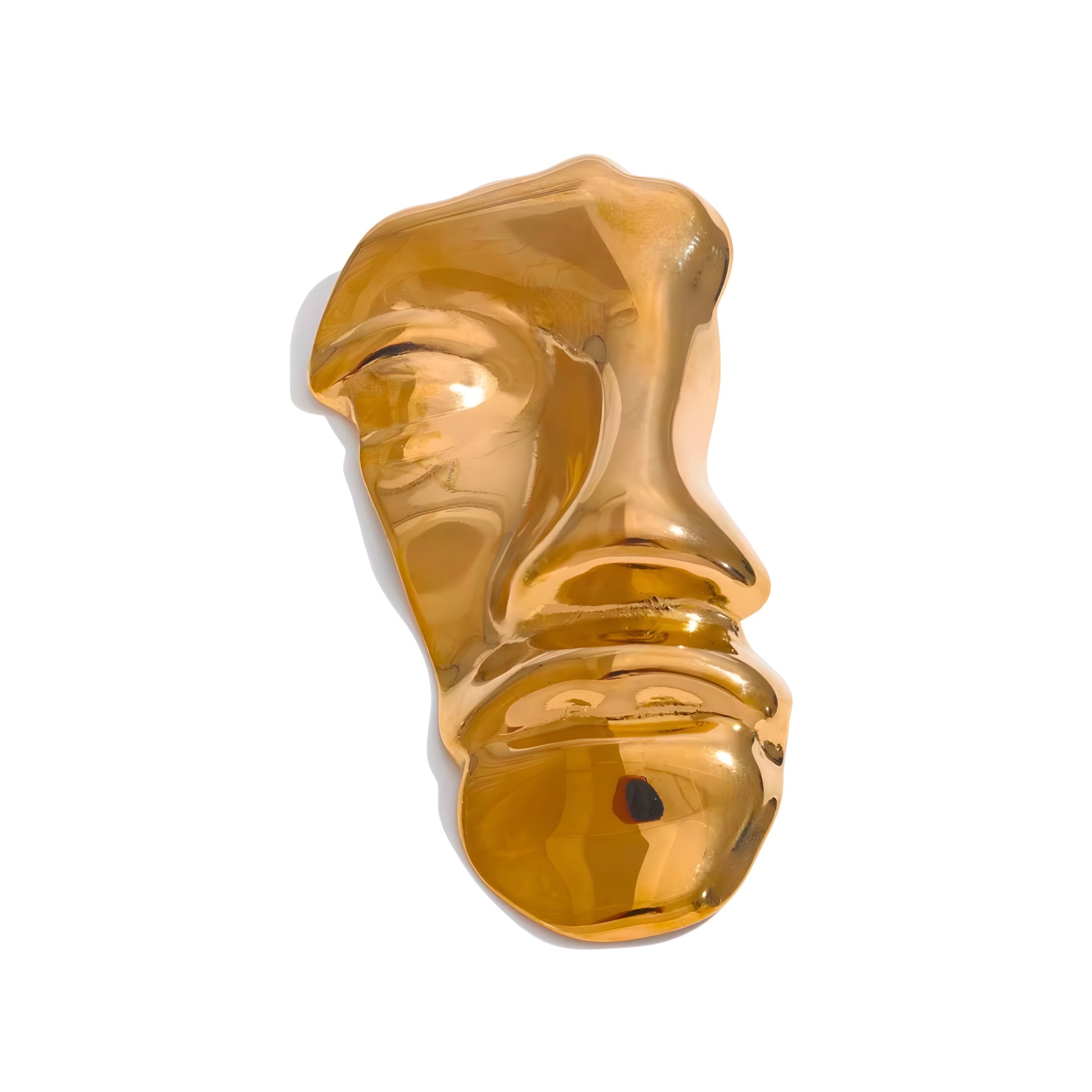 This brooch features a modern and abstract design, shaped like a face with soft and fluid lines. It is gold-plated, giving it a shiny and luxurious appearance. The three-dimensional form beautifully reflects light, adding a touch of sophistication. This artistic and unique piece is perfect for sleek and minimal styles, serving as a statement accessory for any outfit.
