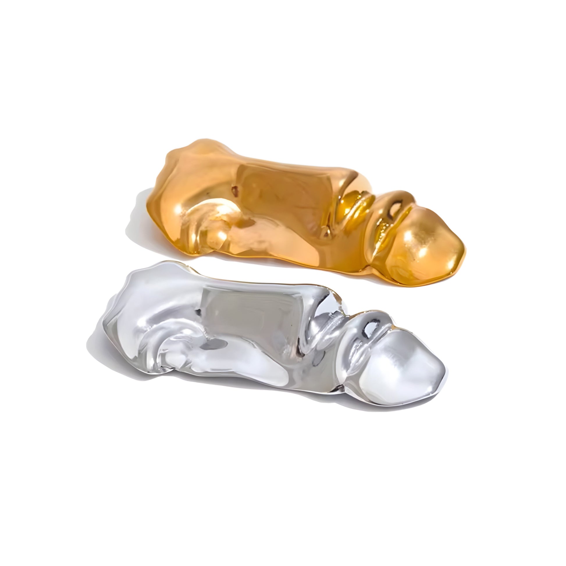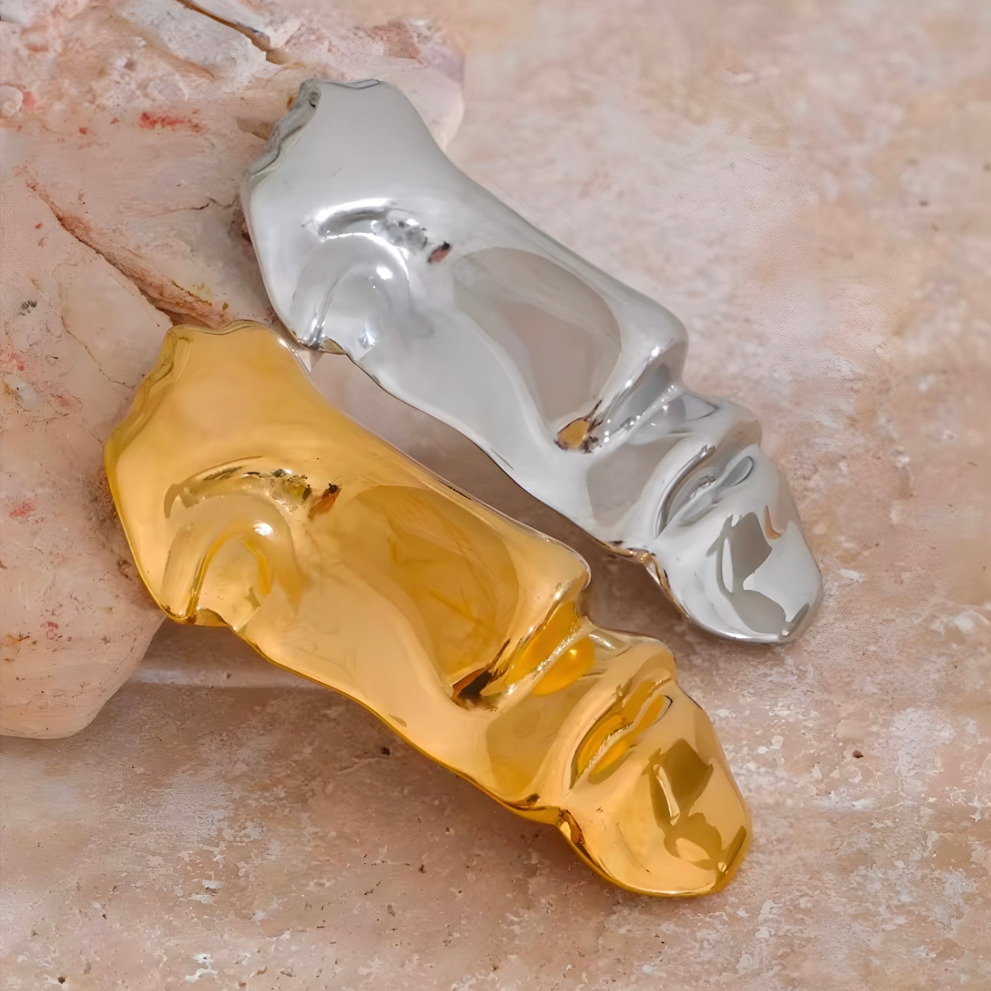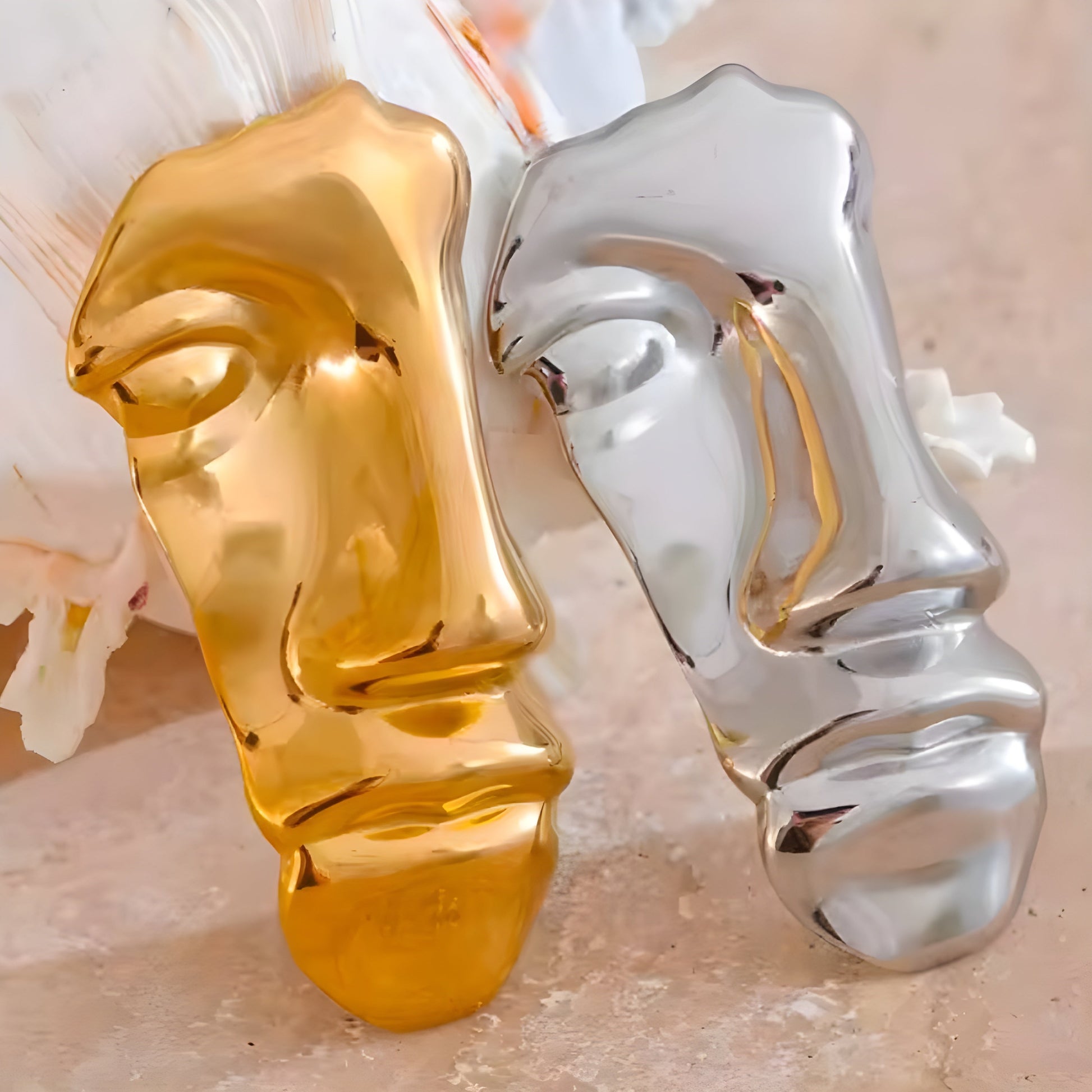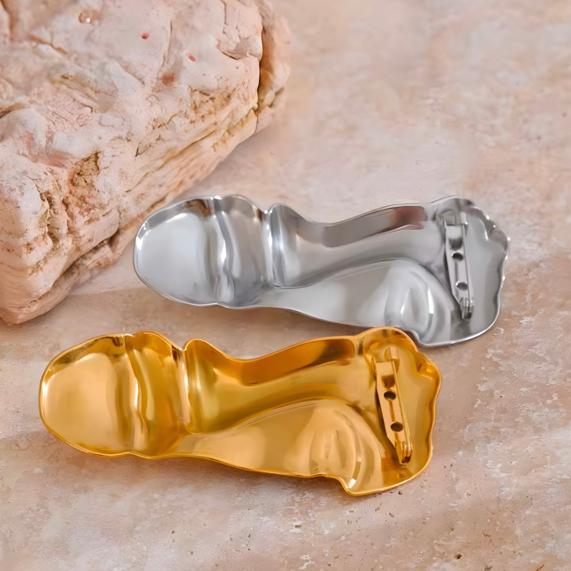 This brooch features a modern and abstract design, shaped like a face with soft and fluid lines. It is gold-plated, giving it a shiny and luxurious appearance. The three-dimensional form beautifully reflects light, adding a touch of sophistication. This artistic and unique piece is perfect for sleek and minimal styles, serving as a statement accessory for any outfit.