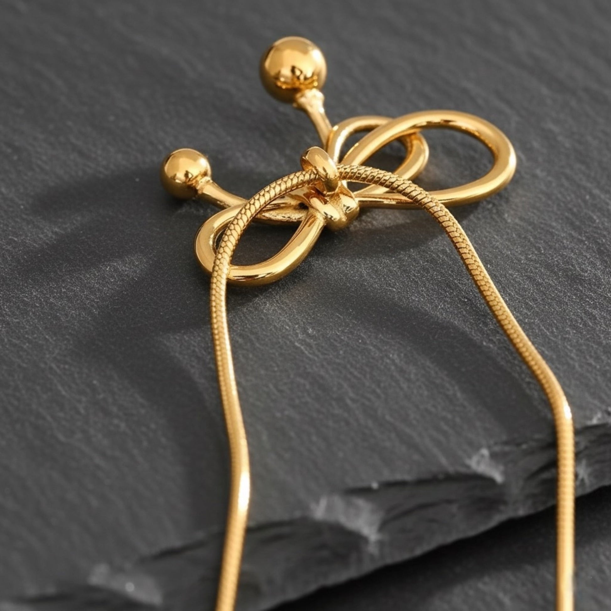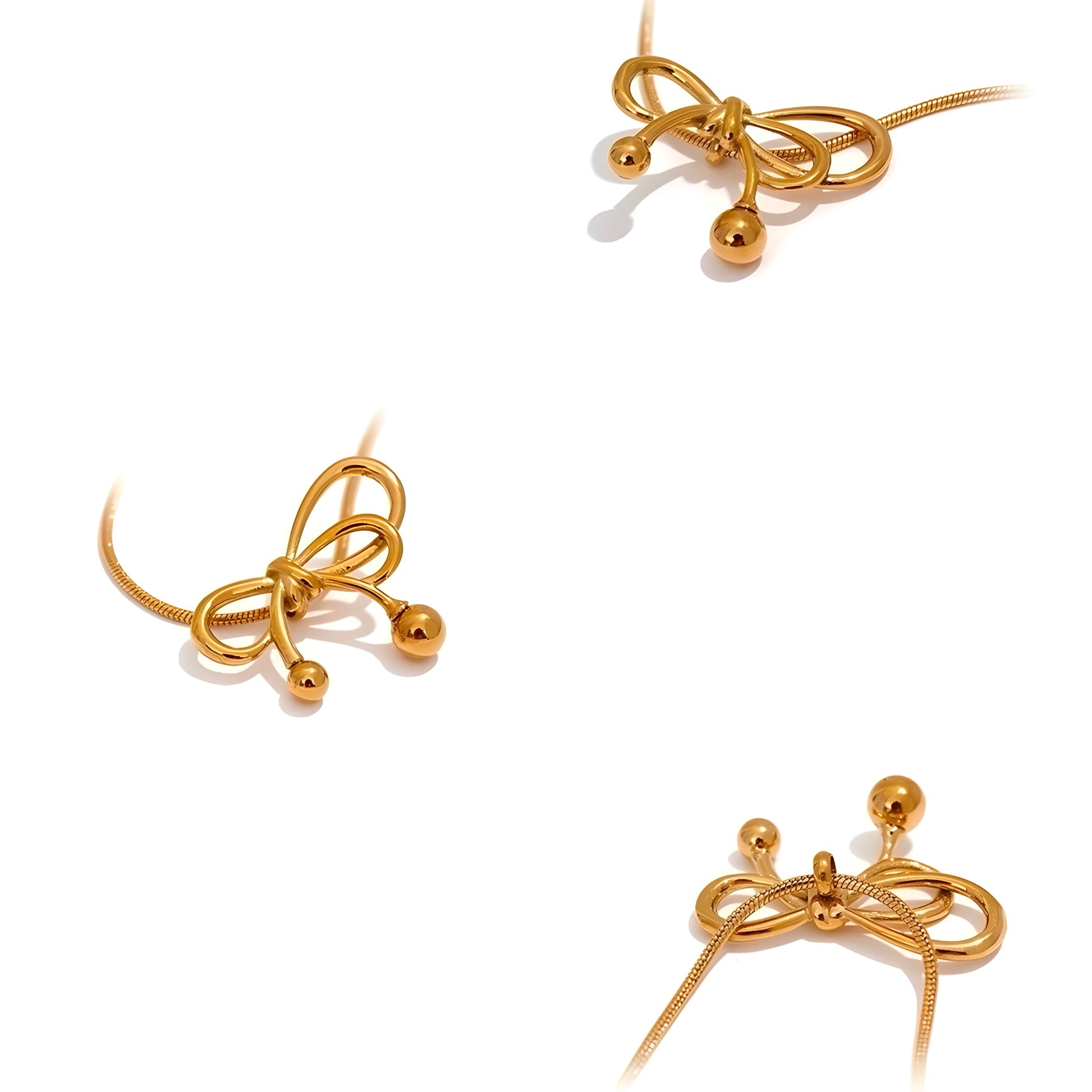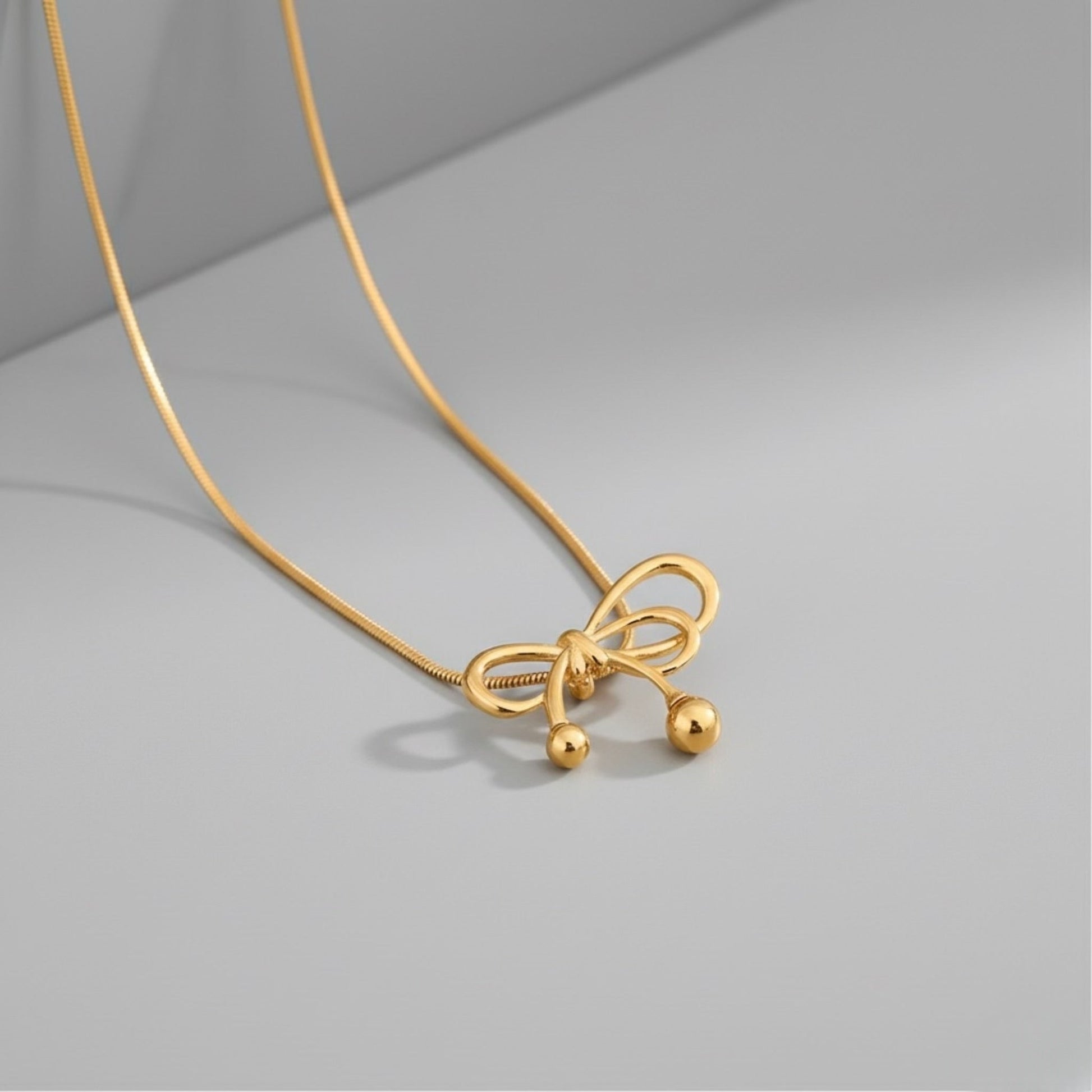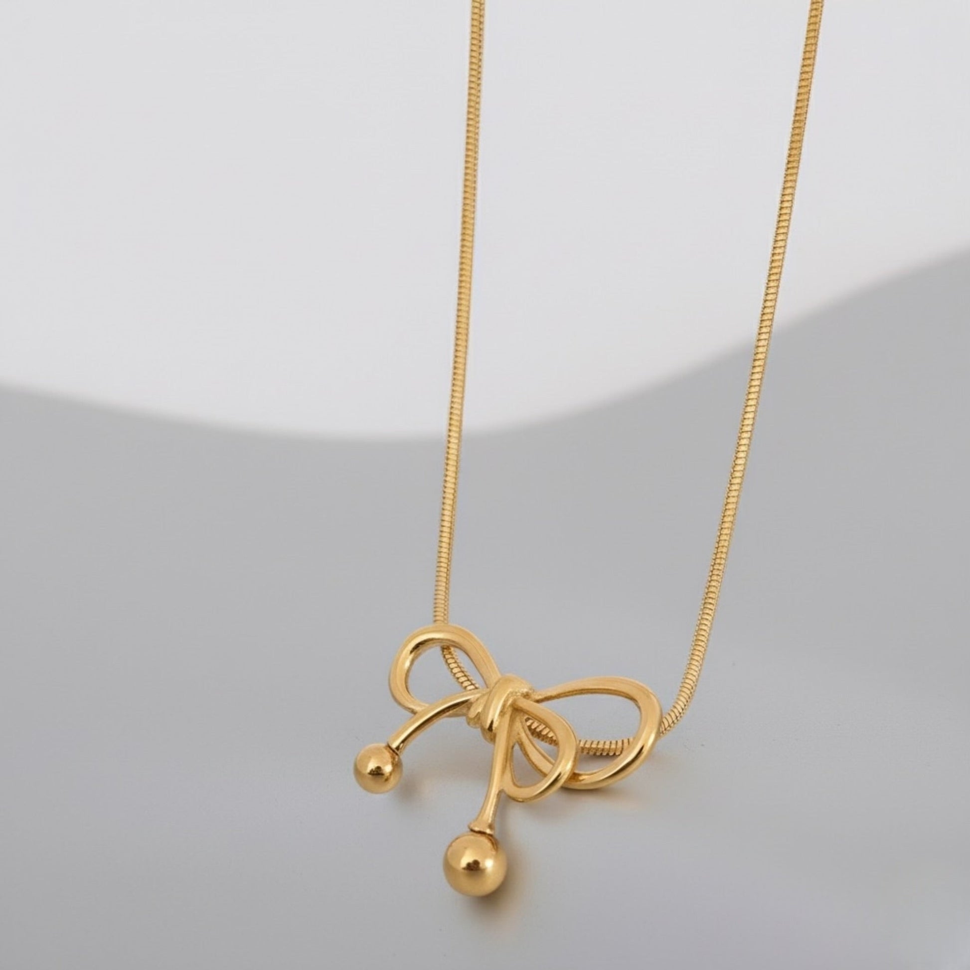 This necklace features a stylish bow design, crafted in polished gold. The shape is sleek and elegant, with two shiny rounded ends that add a playful touch. The chain is a fine, smooth metal thread, creating a delicate and refined look.