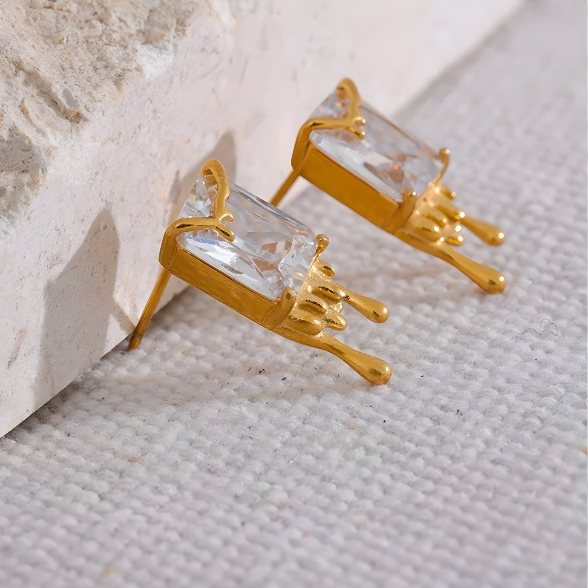 These earrings are a bold fusion of avant-garde design and surrealist art. The gold setting appears to be melting, reminiscent of Salvador Dalí’s works and the surrealism movement. At the center of each earring, a radiant rectangular gemstone contrasts strikingly with the fluid, dripping gold frame, creating a captivating visual effect.