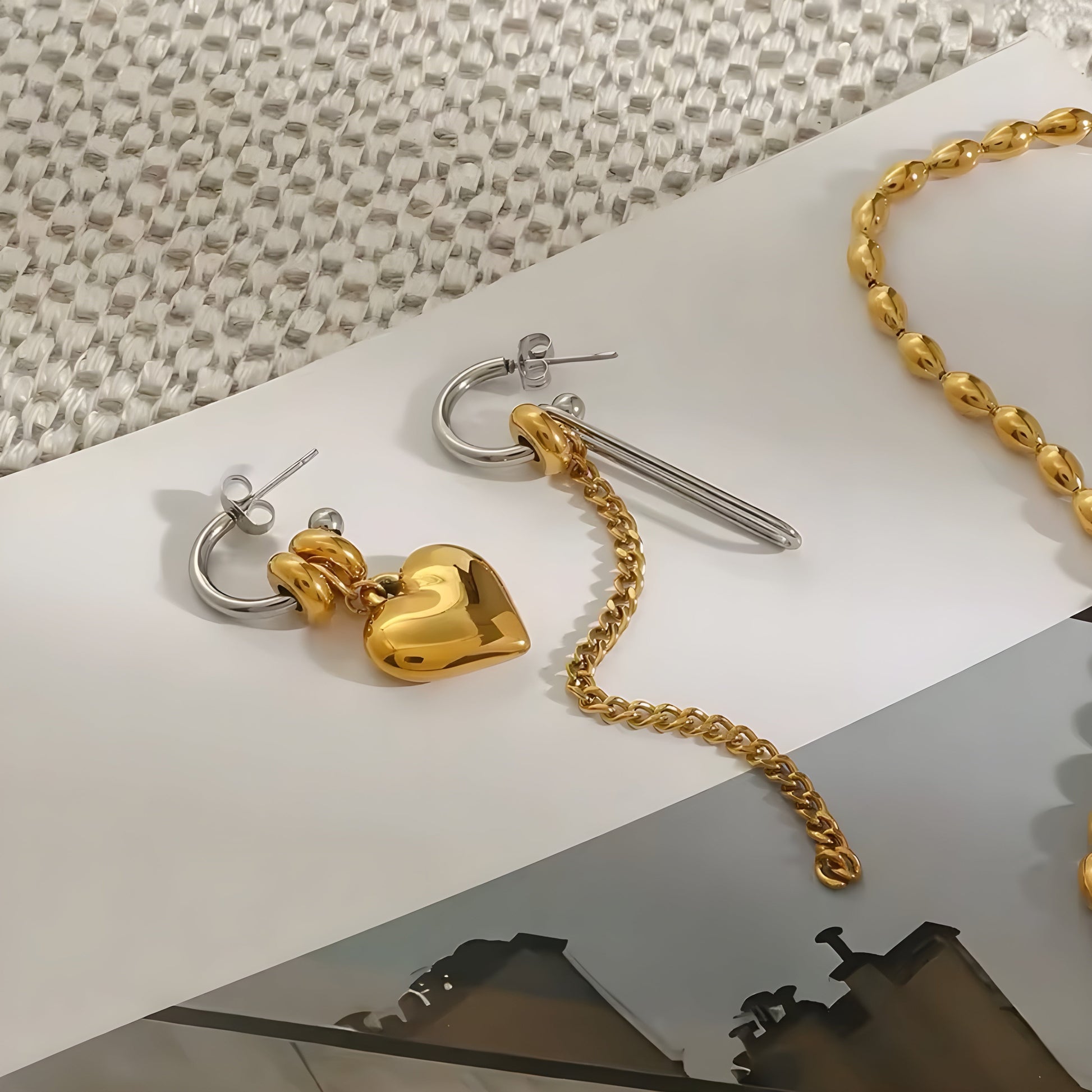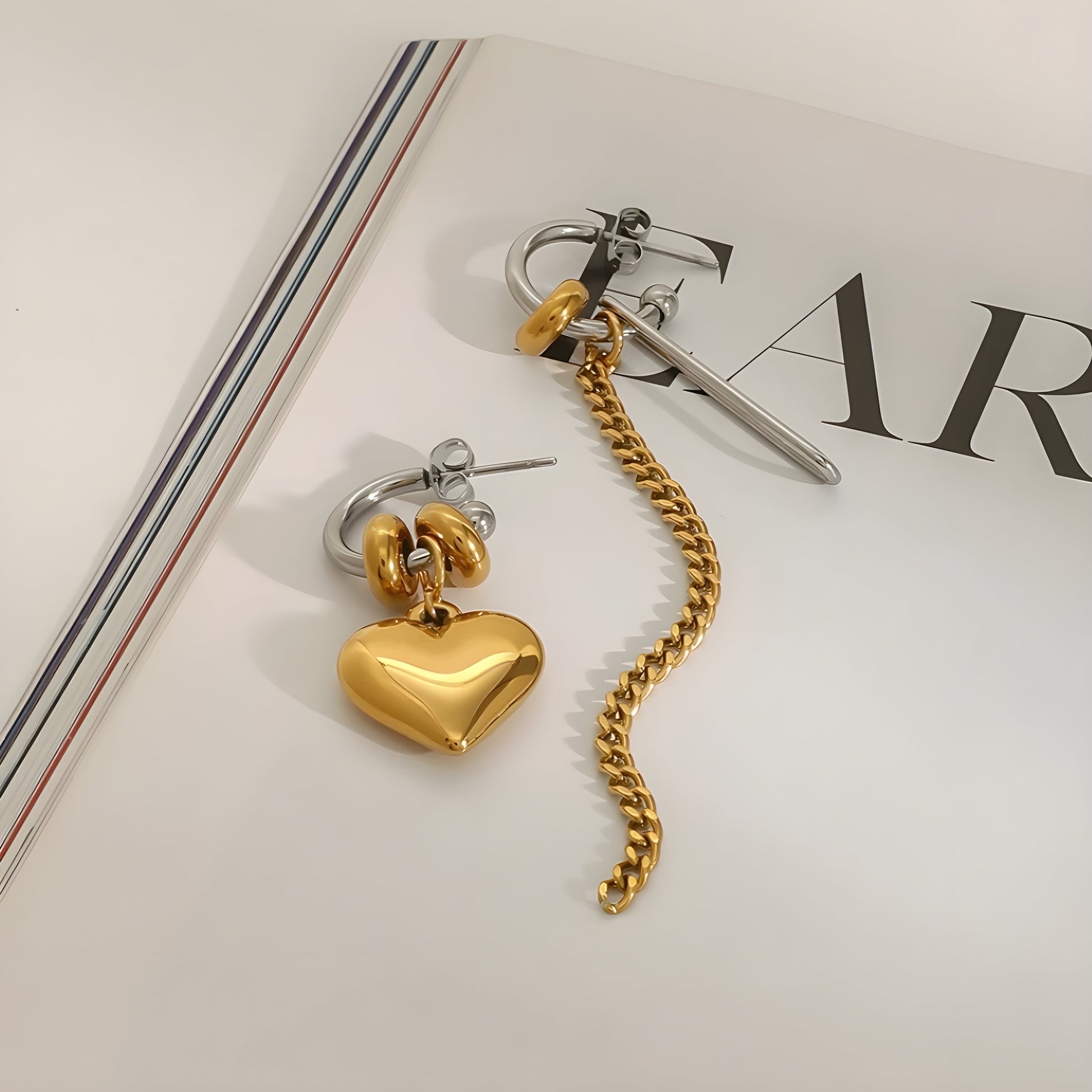One earring features a shiny gold heart pendant, adding a romantic and luxurious feel.