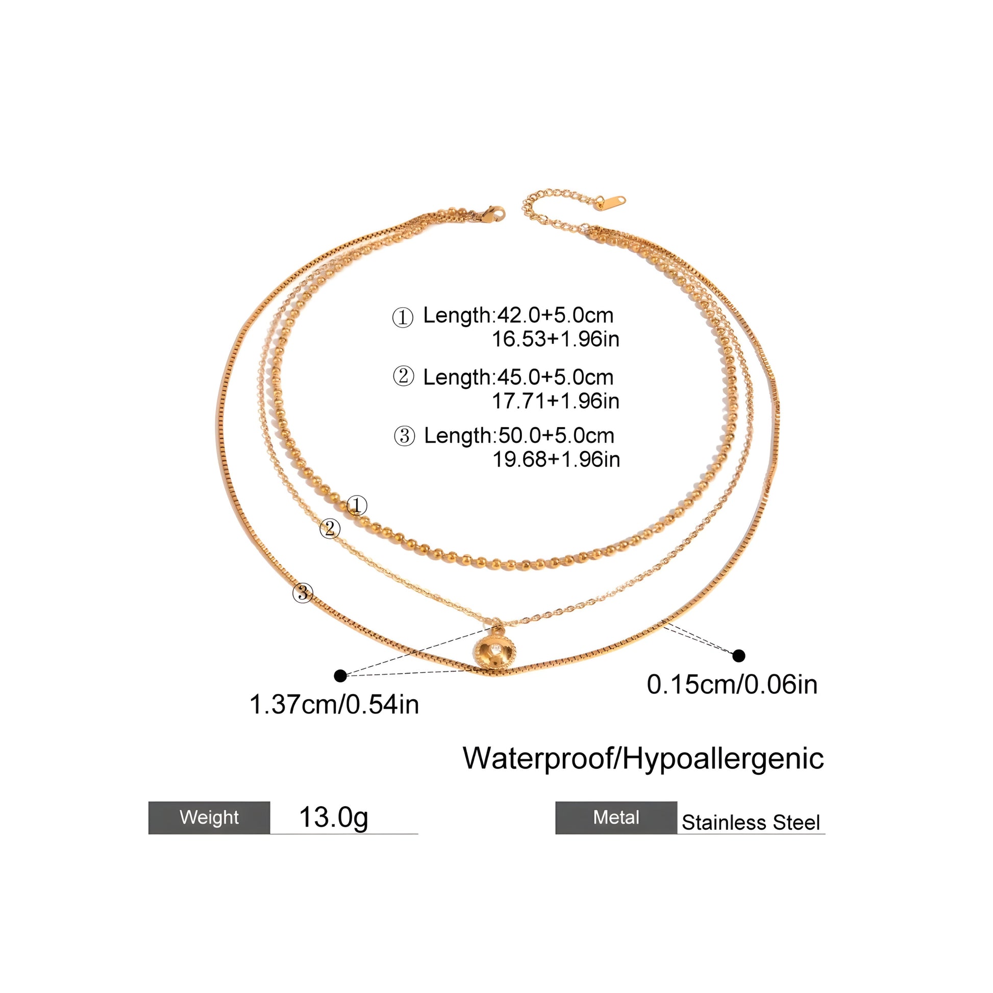 This layered gold necklace combines elegance with modern design. The necklace features three distinct chains, each with its own unique texture and style: