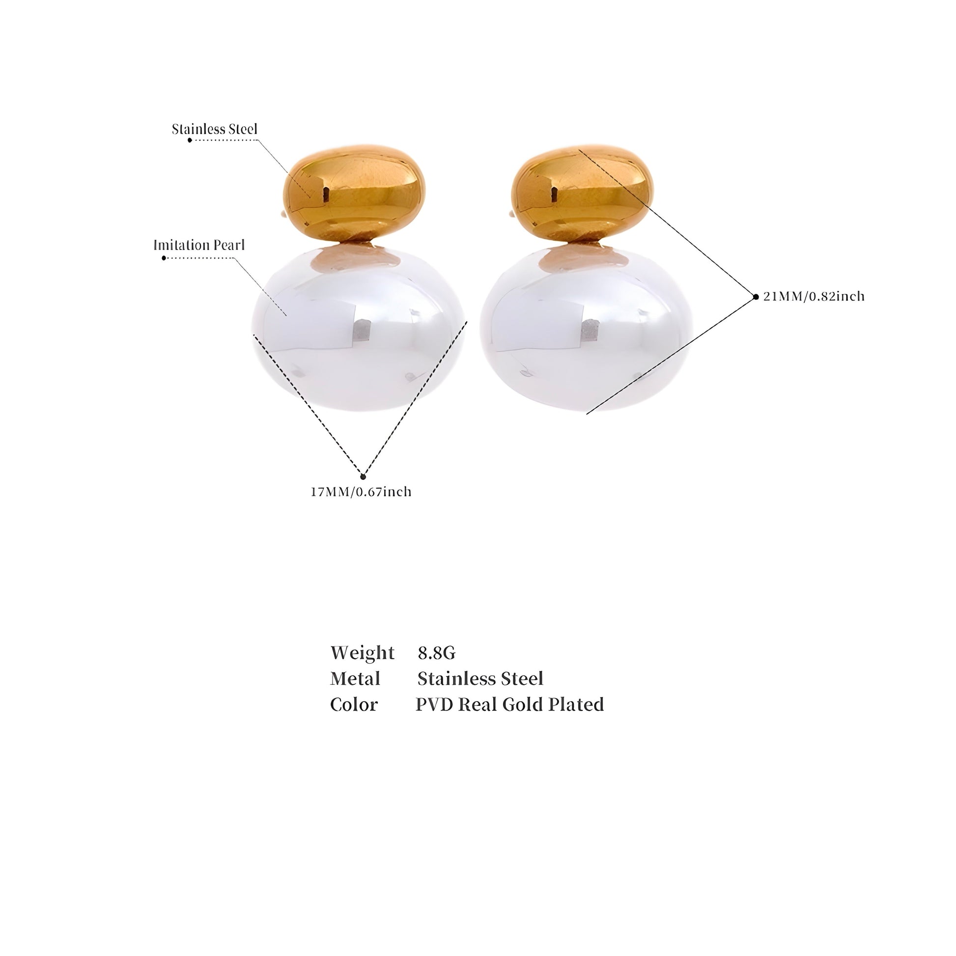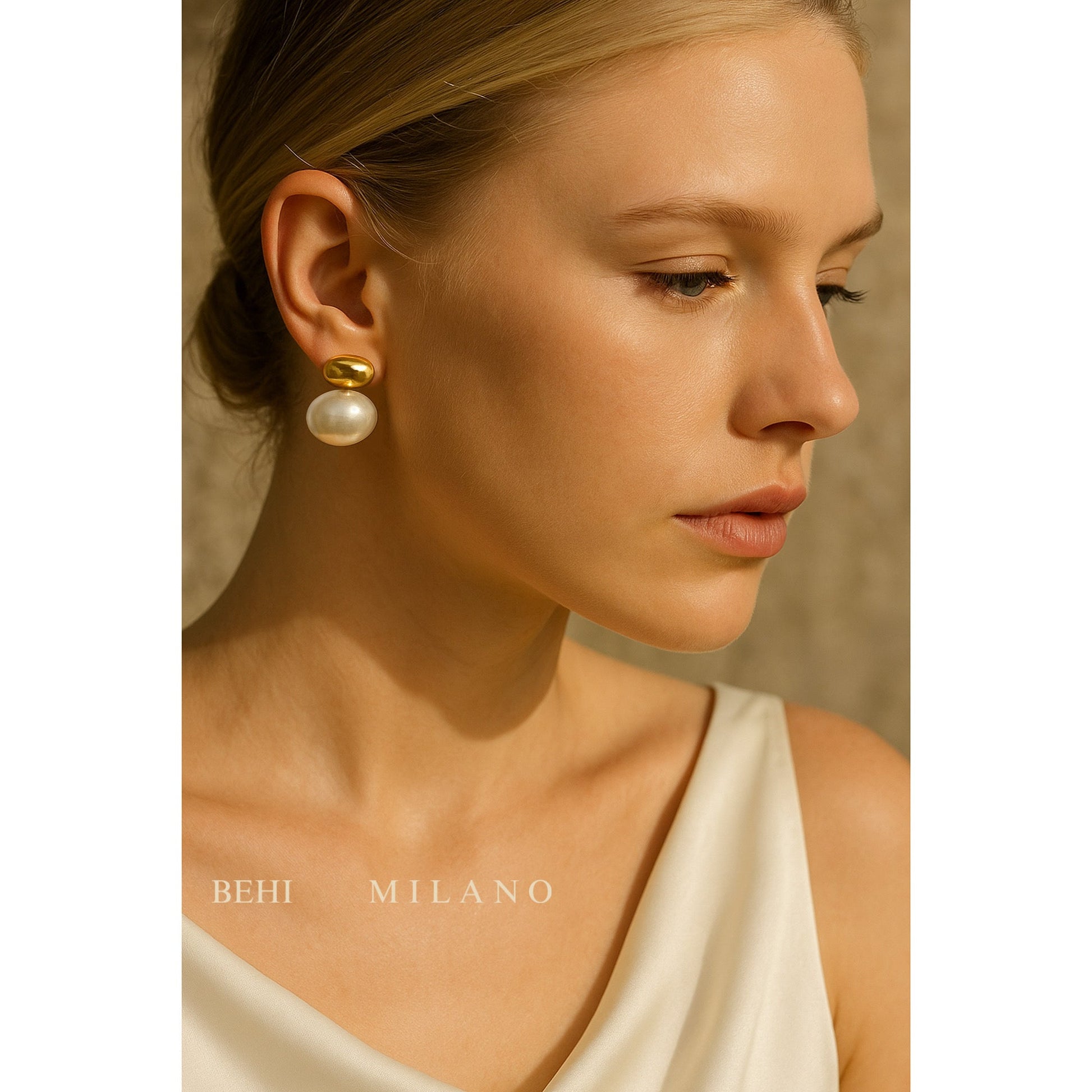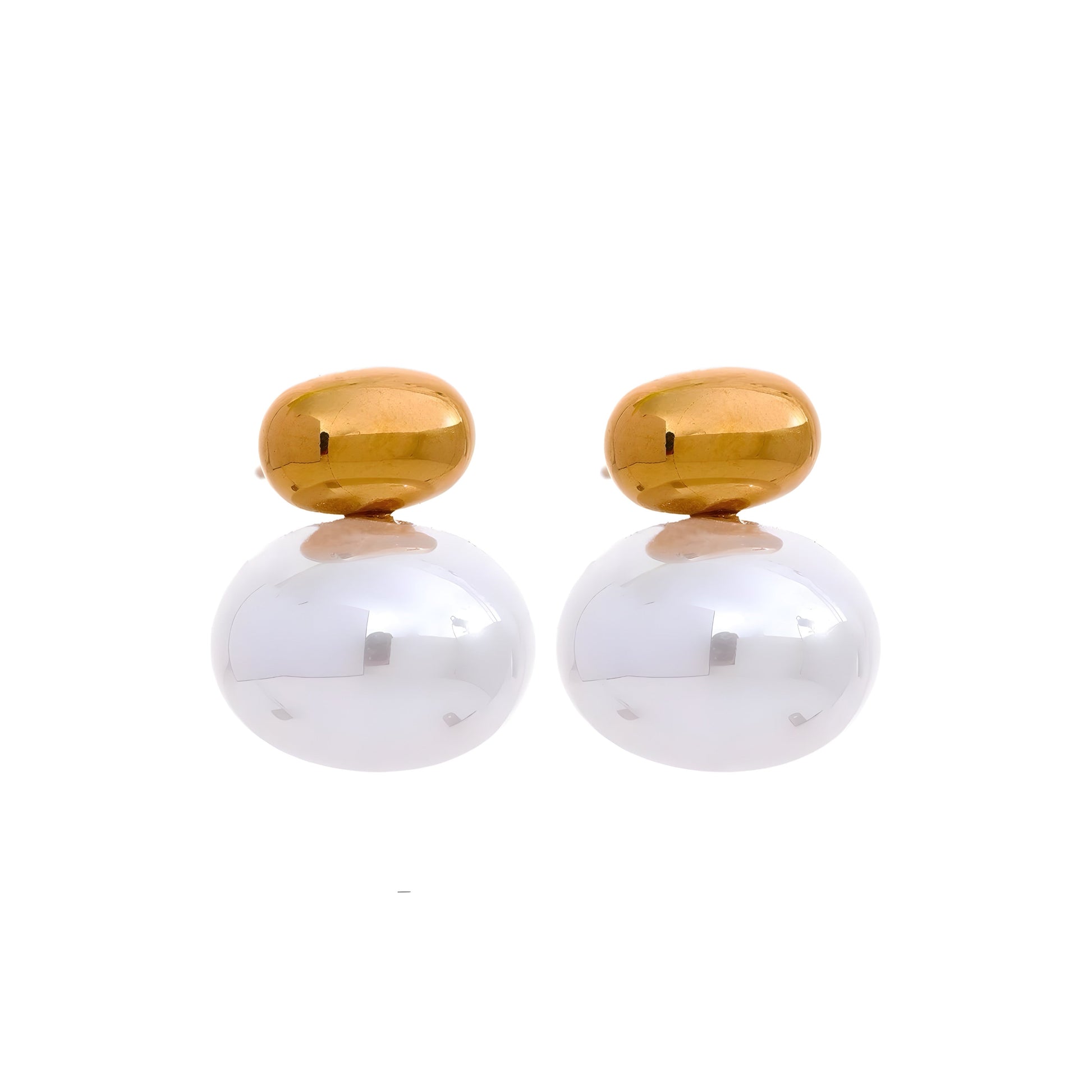 These earrings feature a striking combination of gold and pearl, with a smooth, rounded golden top and a large, lustrous pearl at the bottom. The contrast between the sleek gold and the shiny, white pearl gives the earrings a sophisticated, timeless appeal. The design is minimal yet elegant, making them a statement piece that adds a refined touch to any outfit.