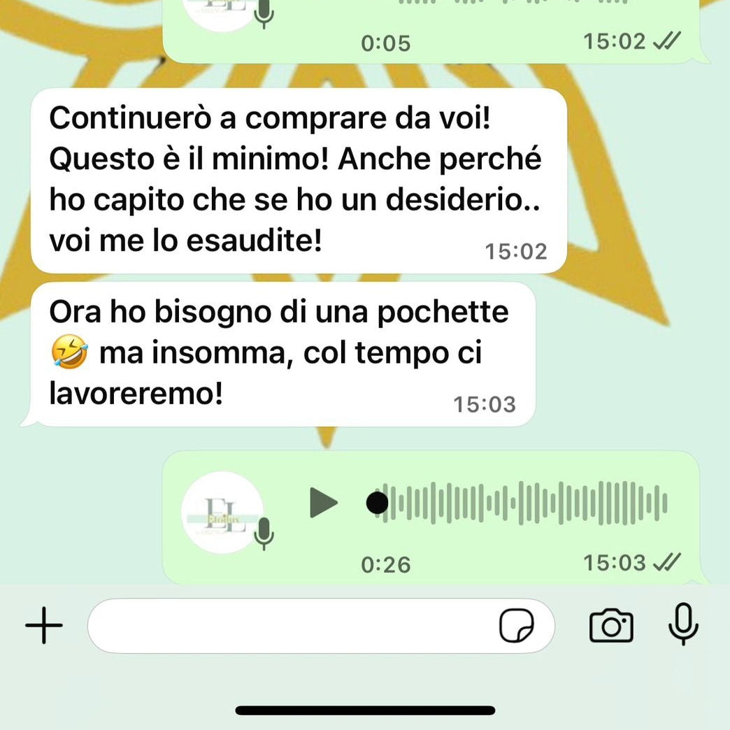 "Ho ricevuto il mio ordine ed è stato un piacere dall’inizio alla fine: disponibilità, fiducia e una gentilezza rara che si percepisce in ogni dettaglio, perfino nel bigliettino personalizzato. Il portafoglio è esattamente come lo desideravo: bello, elegante, perfetto."