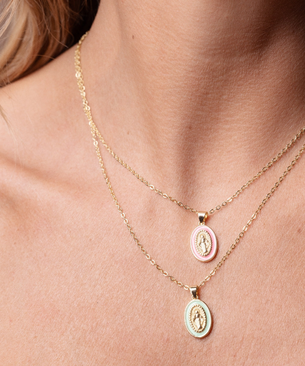Questa elegante collana con ciondolo smaltato raffigura una delicata madonnina, simbolo di protezione e fede. Perfetta per chi desidera un accessorio raffinato che unisce spiritualità e stile, è ideale da indossare ogni giorno o in occasioni speciali. Un gioiello che dona un tocco di significato e bellezza al tuo look.