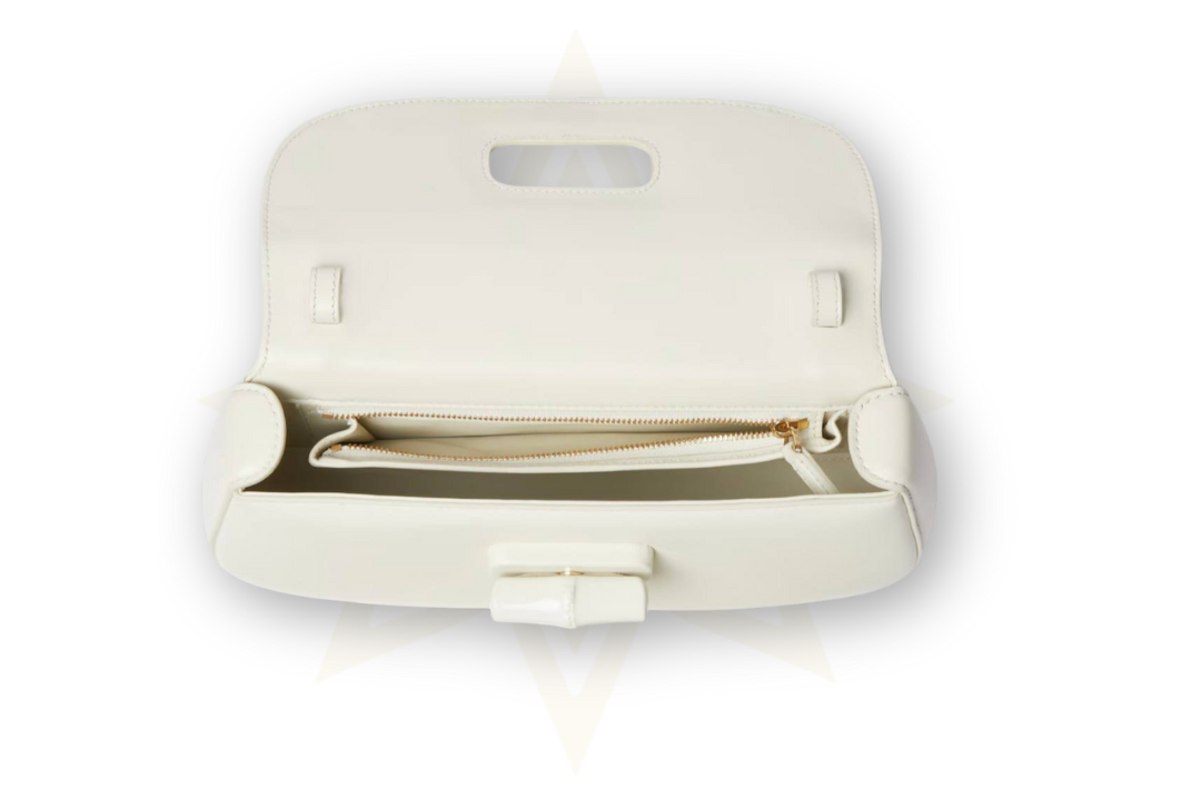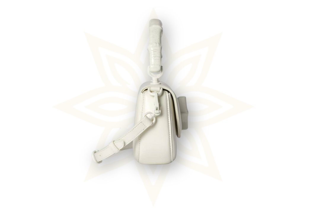 Realizzata in pelle liscia bianca, questa borsa unisce il fascino artigianale all’eleganza contemporanea. Il design strutturato è completato da una chiusura frontale con dettaglio bamboo tono su tono, una tracolla regolabile e rimovibile e un interno ben organizzato con tasca con zip.
