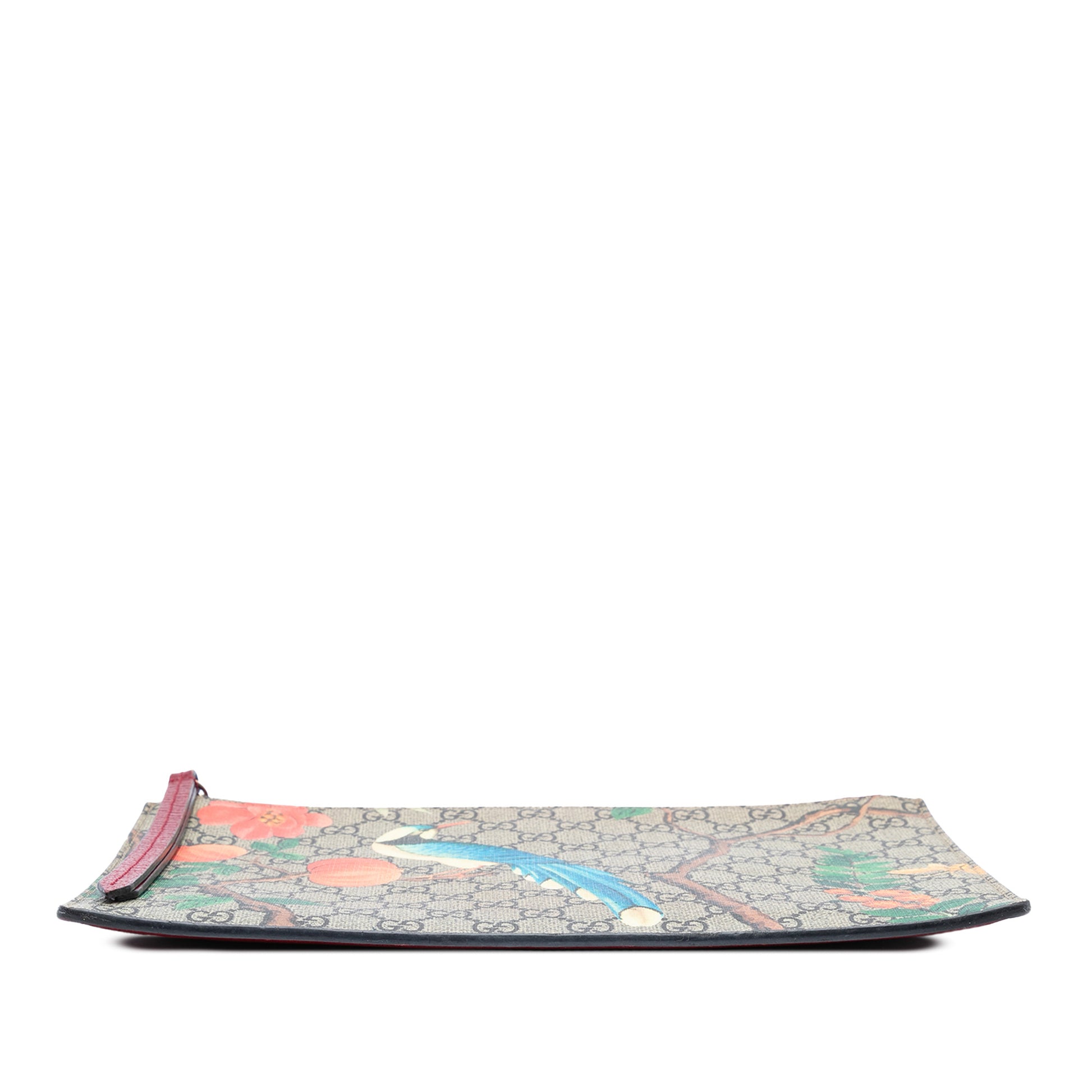 Questa elegante pochette Gucci fa parte della raffinata collezione Tian, ispirata alle illustrazioni naturalistiche orientali. Realizzata in tela GG Supreme marrone con stampa floreale e dettagli in pelle di vitello bordeaux, racchiude il savoir-faire italiano del marchio in una silhouette essenziale e sofisticata.