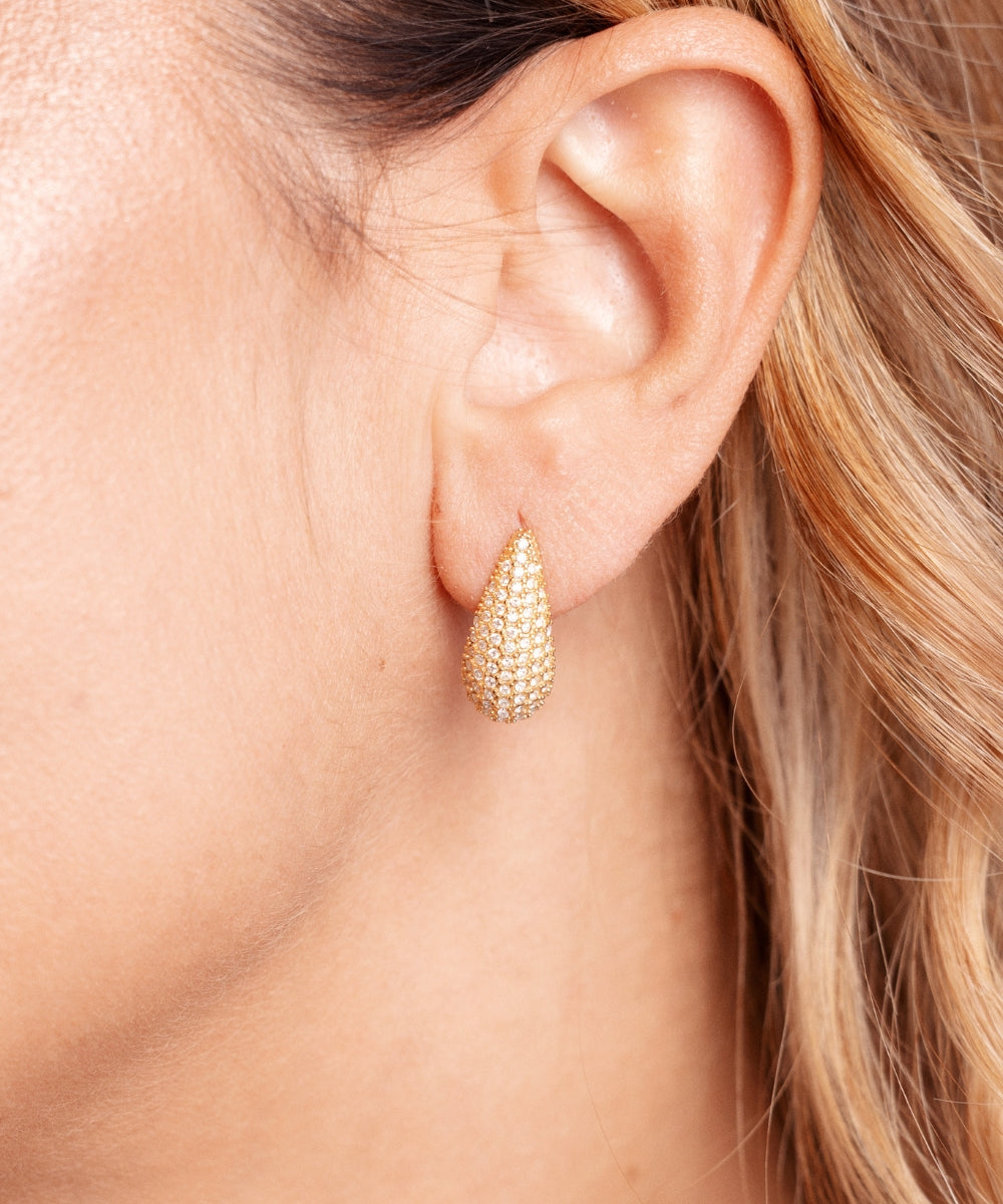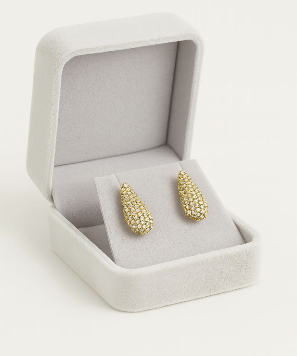 Gli orecchini Luxury a forma di goccia sono impreziositi da pietre luccicanti incastonate su tutta la superficie, catturando la luce ad ogni movimento. Un accessorio elegante e raffinato, perfetto per chi desidera aggiungere un tocco di brillantezza e classe al proprio look, ideale per occasioni speciali o per valorizzare ogni giorno con stile.