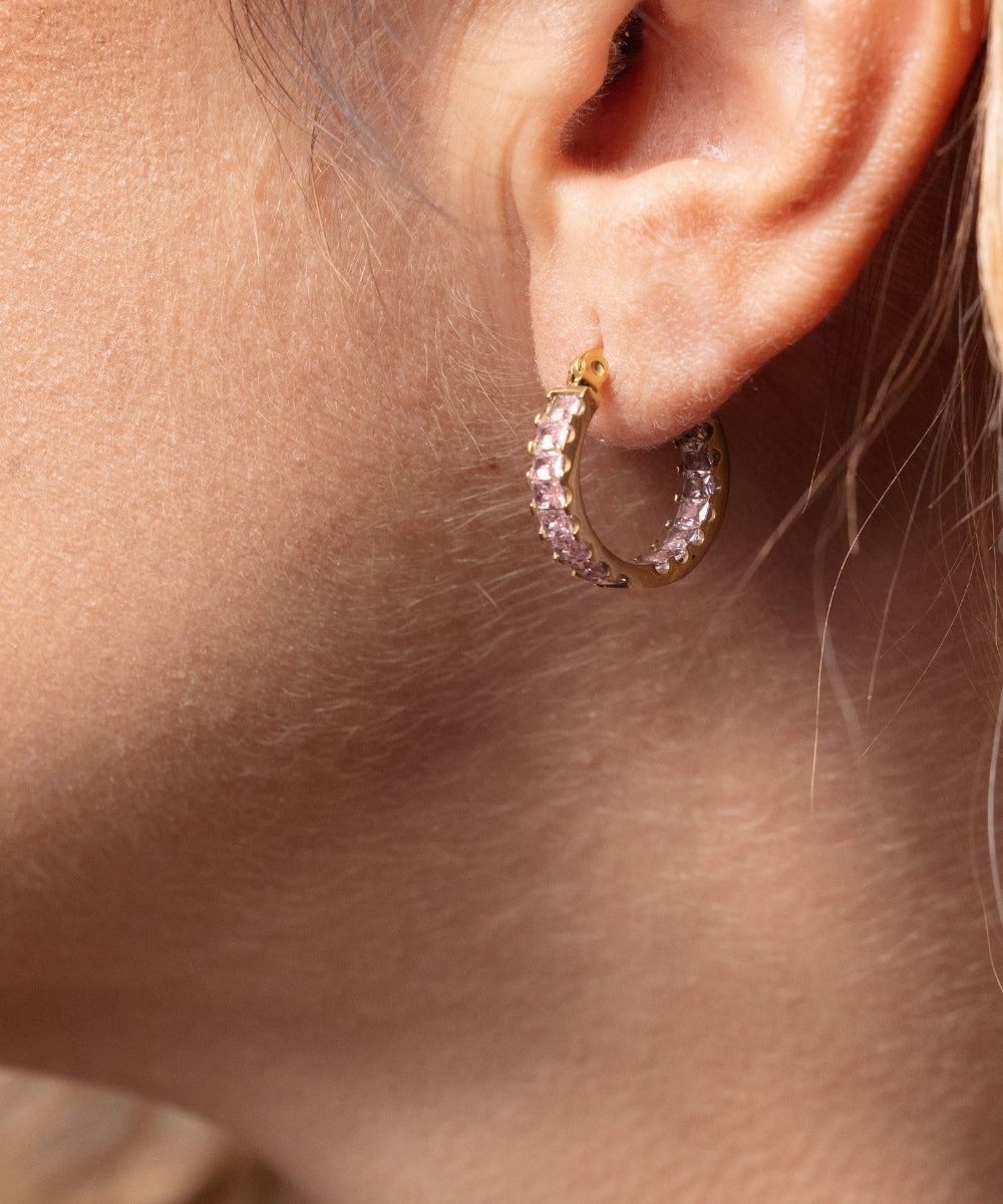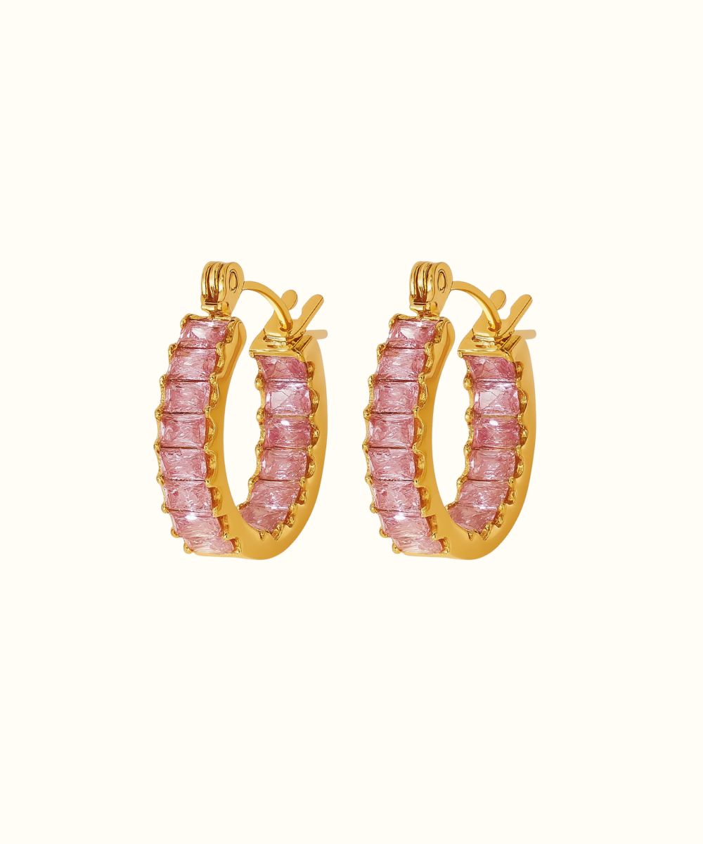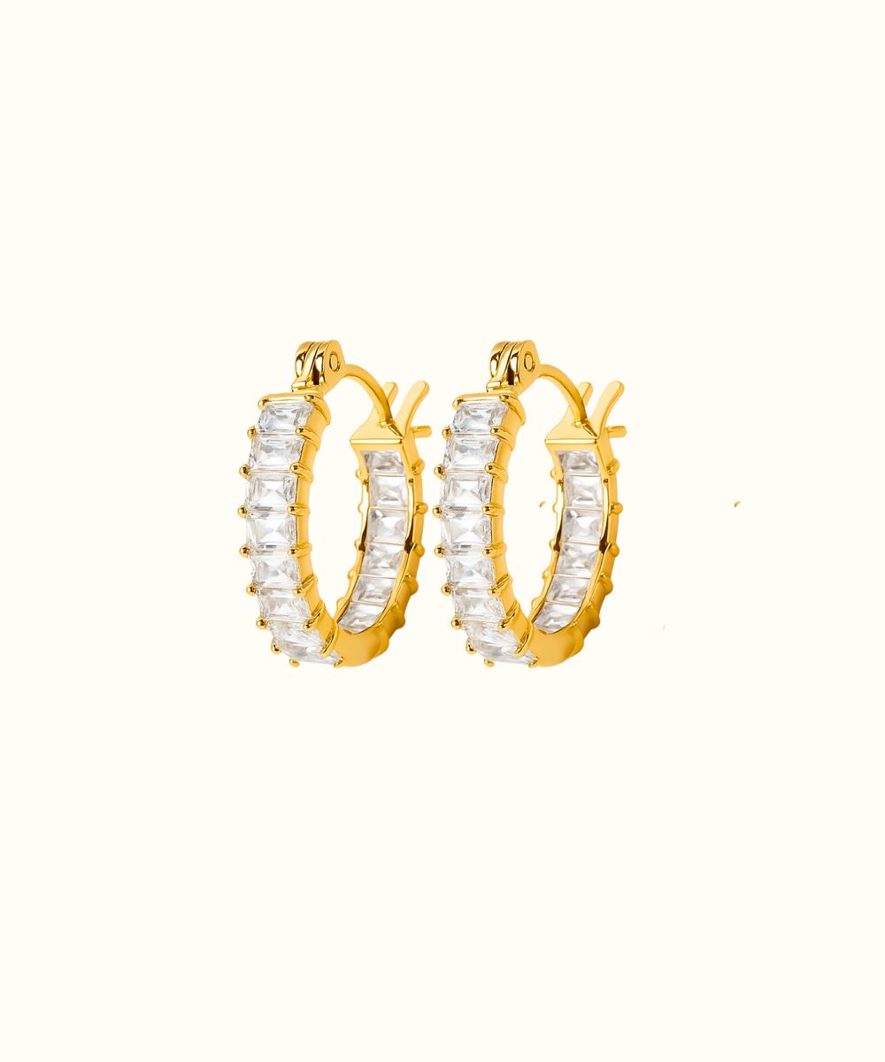 Questi eleganti orecchini a cerchio uniscono la brillantezza senza tempo dei zirconi bianchi taglio princess alla calda luminosità dell’oro intenso. Il design raffinato mette in risalto una fila ordinata di gemme incastonate con precisione sia all'esterno che all'interno dell’arco, garantendo una scintilla visibile da ogni angolazione. La chiusura a scatto assicura comfort e praticità. Perfetti per aggiungere un tocco di classe a qualsiasi look, dal casual al più sofisticato.